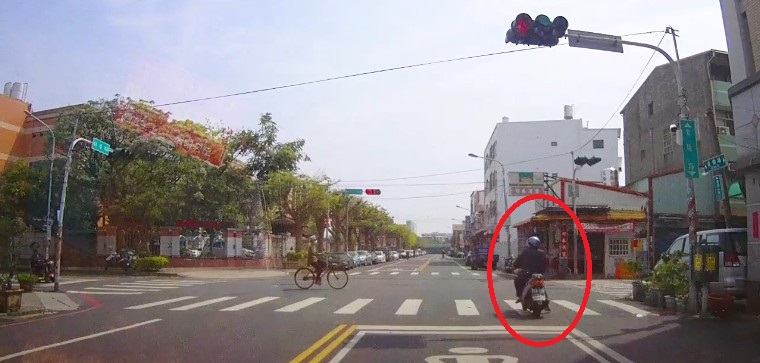 ▼影片中,一位歐巴桑騎到紅燈處時,眼看沒有車,就不停下直接騎了過去。