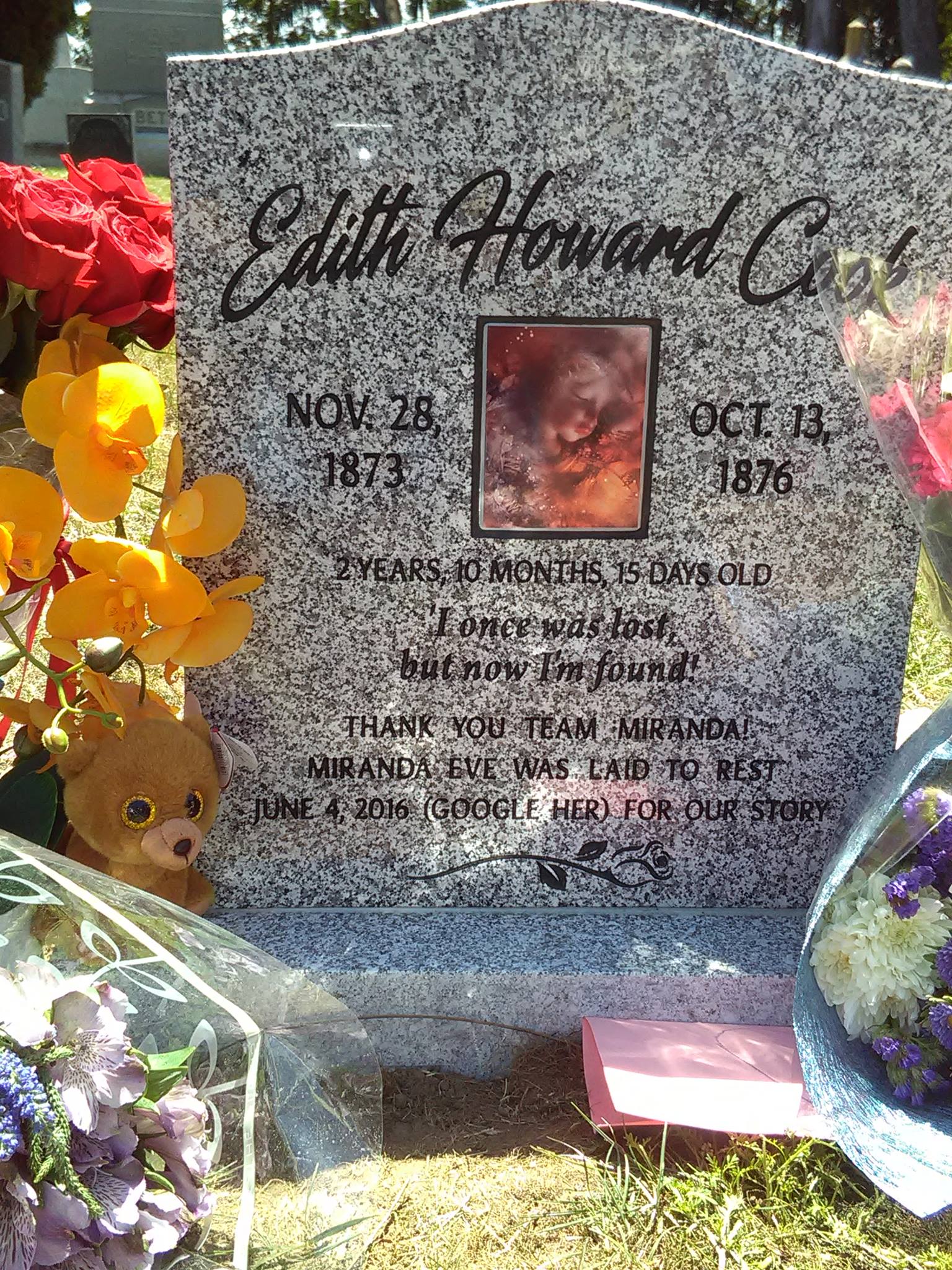 翻查墓園的檔案後,他們才確認這位女孩應該是2歲的伊迪絲(Edith Howard Cook),在1876年過世。他們唯一聯繫到的伊迪絲血親是住在加州的彼得(Peter Cook),他現年82歲,是伊迪絲的曾曾姪子。