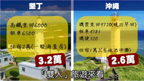 ▼許多人都認為去墾丁不如出國去海島沖繩玩,事實上,如果以從台北出發的雙人旅遊來看,沖繩只要買到便宜的廉航機票,全部的交通和住宿花費僅要2萬6,比去墾丁還便宜6千塊,何況沖繩周邊景點豐富,也難怪大家會作出「不如出國」的選擇。