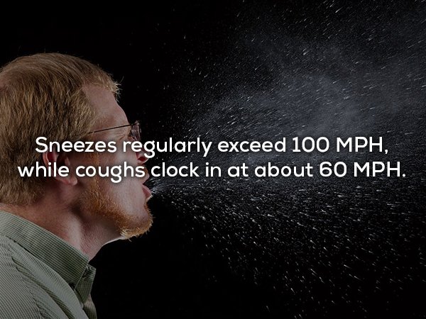 ▼噴嚏飛沫的飛行速度為每小時100英里,咳嗽飛沫的飛行速度是每小時60英里