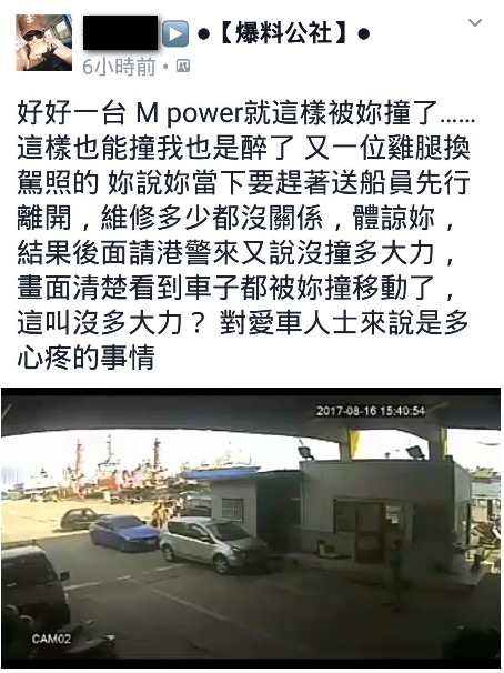 ▼當時雙方當面對質之後,女駕駛表示因為要趕著送船員必須先行離開,還說「維修多少都沒關係」,因為船班時間不能延誤於是當時他選擇體諒對方,沒想到後來請港警來處理時,女駕駛卻改口說「又沒撞多大力」,讓男車主十分傻眼。