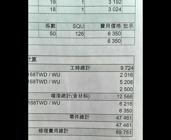 ▼最後男車主選擇將車子送回原廠維修,估價單也在網路上公開,一共要價6萬9千多元!