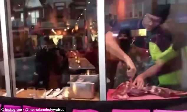 ▼抗議者們看到這一幕都要瘋了,忍不住拍攝下來,說:「他在嘲笑我們,這間餐廳的老闆在嘲笑合法、和平的抗議,他將一隻動物的腿送到了客人的餐桌上」、「他的行為讓我震驚,也很難過。對我來說,那是一隻動物,一隻不想死的動物」。