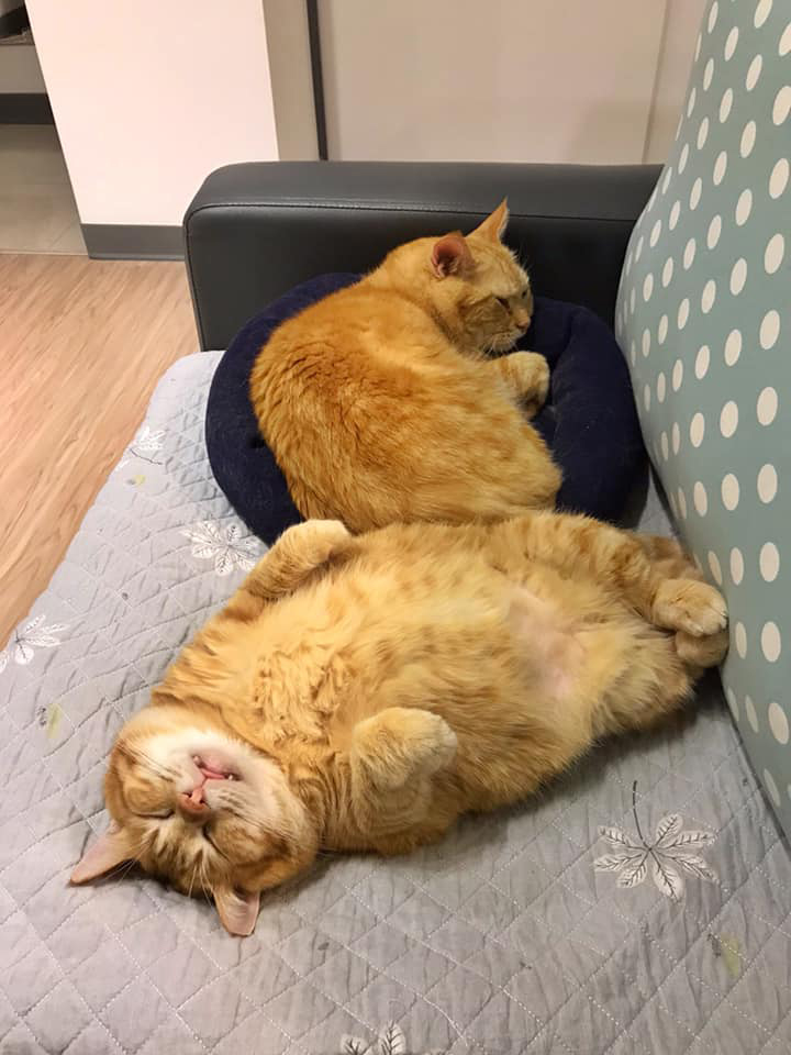 ▼肥祥還有一個好夥伴,那就是同樣為橘貓的帥哥!帥哥的體型比肥祥大一些,兩隻貓咪相處融洽,窩在一起時就像2顆橘色的毛球。