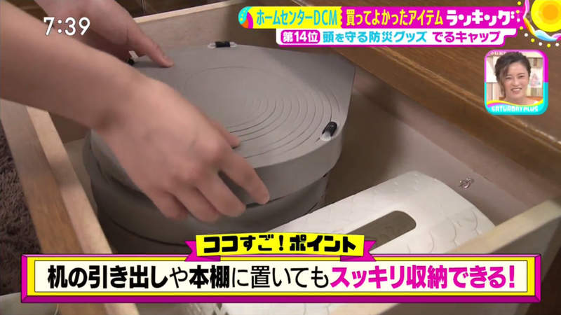 ▼安全帽是很重要的防災用品,但傳統的安全帽太難收納,放在家中要佔很大的空間。「でるキャップ」就不一樣了,這款安全帽是用聚乙烯材質打造的,可以折疊成扁平狀,收納非常方便。別看它造型奇特,該有的功能一點也沒有少,防撞、防火功能都超強。