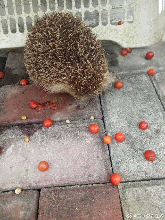 ▼小刺蝟偷吃櫻桃,民警給牠打包帶走: