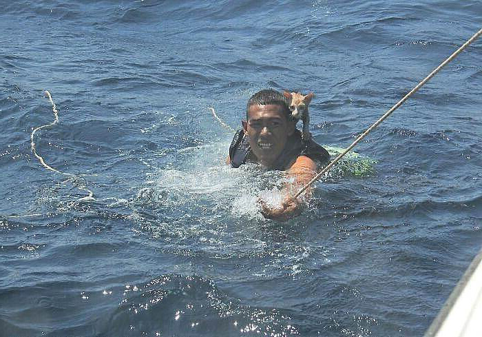 ▼小貓們非常驚慌,不斷探頭尋求逃生的機會。23歲的水兵Thatsaphon Saii見狀,毫不猶豫地脫下制服、穿上救生衣,獨自游向漁船。他將其中3隻貓咪裝在舊米袋中,讓最後一隻貓咪抓著自己的救生衣,然後在同袍的繩索支援下,安全將4隻小貓送到艦艇上。