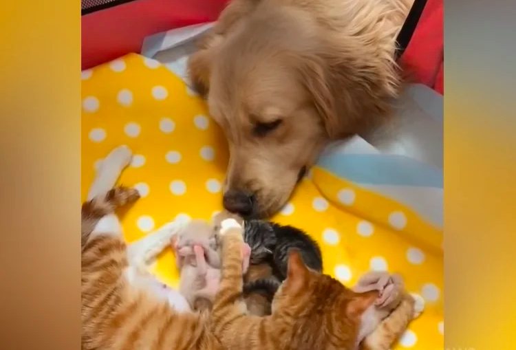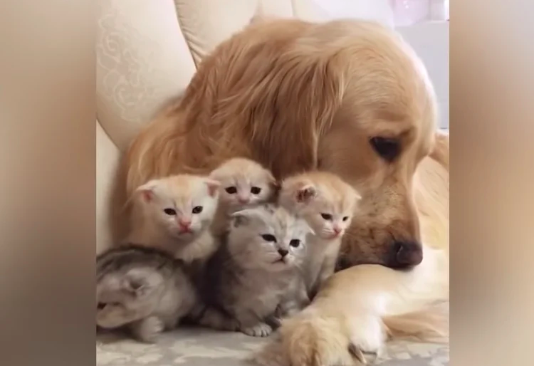 2021年09月10日黃金獵犬溫柔友善,跟其他物種的動物也能相處得很好~國外有一隻金金非常喜歡貓咪,牠不是跟一隻貓咪交朋友,而是愛上了一窩貓咪!貓媽媽剛剛生下5個寶寶,金金就迫不及待跑過去趴在小貓身邊。牠的臉上還帶著甜甜的笑容,就像那是牠的小孩一樣。