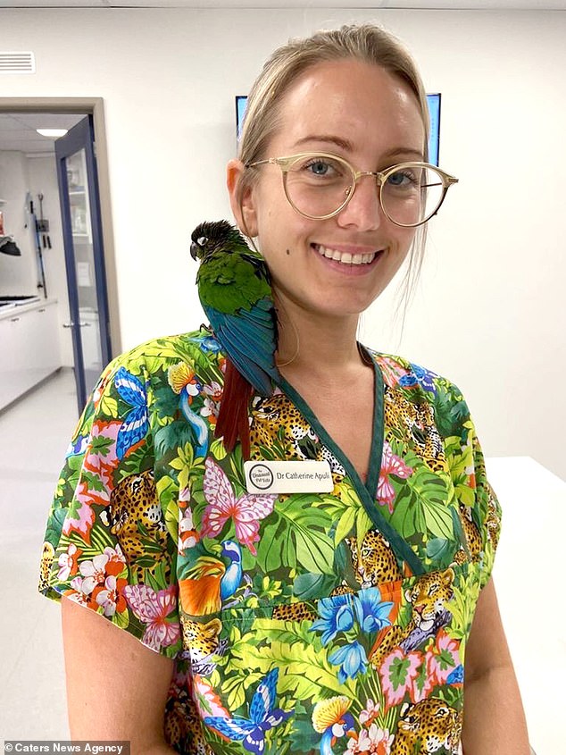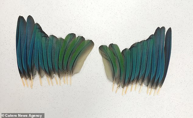 ▼主人帶Wei Wei到獸醫診所「The Unusual Vets」,請獸醫Catherine Apuli幫忙治療。診所裡有很多好心人捐贈的鸚鵡羽毛,獸醫把這些羽毛洗淨、消毒,然後一根一根黏到Wei Wei被剪短的羽毛上。