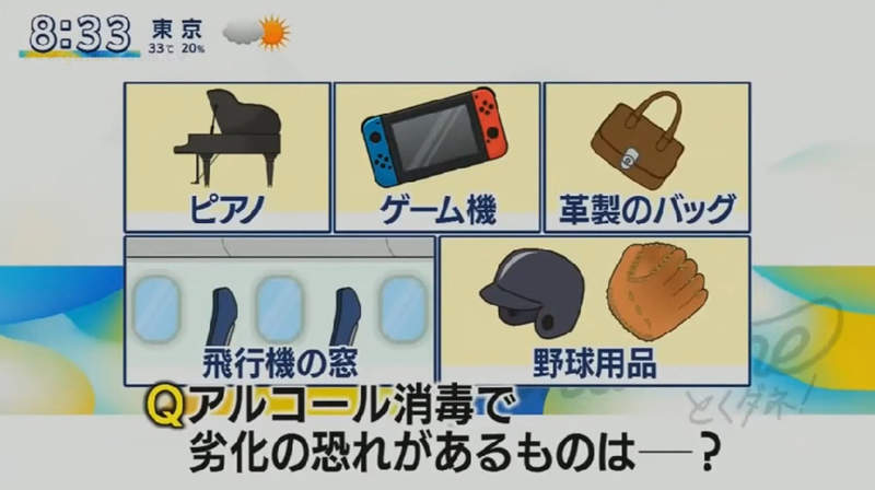 2021年09月10日疫情期間,酒精這類消毒產品成為了人們生活中的必需品。但在家中各處噴灑酒精,用酒精擦拭所有的東西可能會引發很多問題。日本富士電視台的晨間情報節目「とくダネ!」就做了一個「濫用酒精」的專題報導,來告訴大家酒精對很多產品可能造成的破壞。