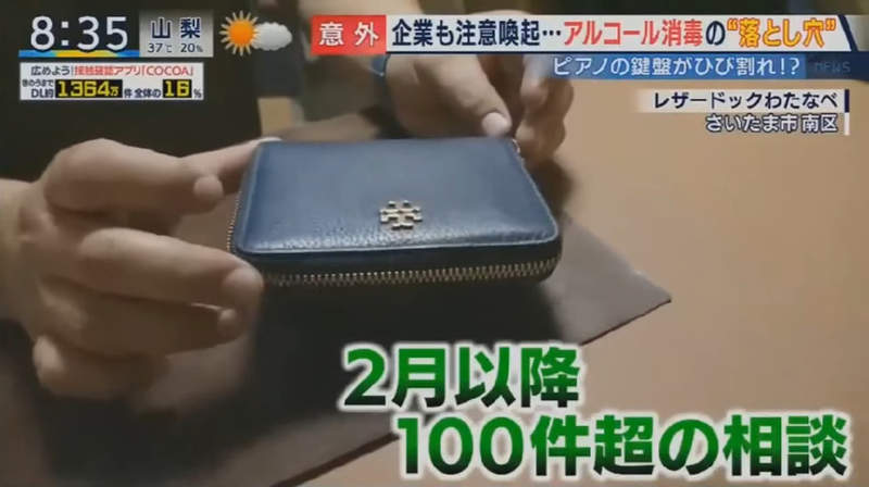 ▼以皮革產品為例,節目組採訪了專門修復皮革產品的店家。店家表示,從2月以來接到大量諮詢與案件,都跟酒精破壞皮革有關。