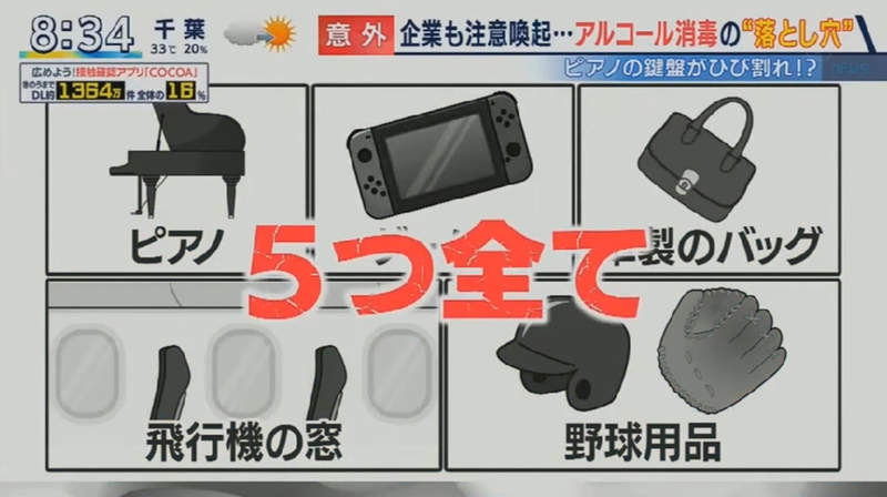 ▼鋼琴、Switch遊戲主機、皮革包、飛機窗戶、棒球用品,這些全都不能用酒精來消毒!