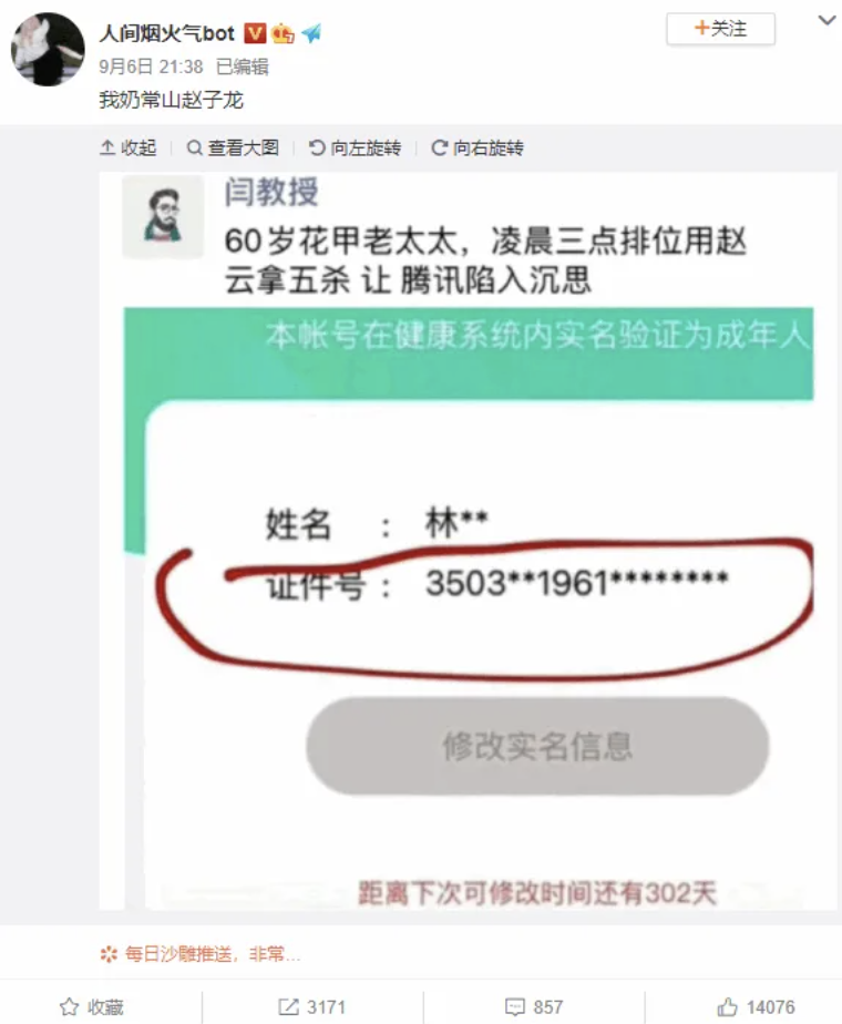 ▼最近一名網友上傳截圖,發現有一位1961年出生的老奶奶成功完成健康系統的實名認證。原po調侃說:「我奶常山趙子龍。」網友們都認為這是未成年人用家長的身份證訊息完成實名認證來玩遊戲。因為這件事討論度太高,騰訊決定進行調查。