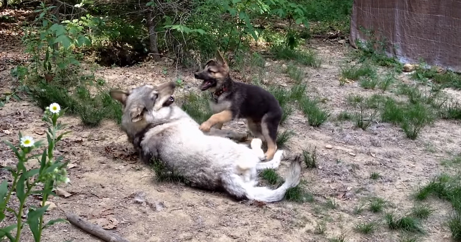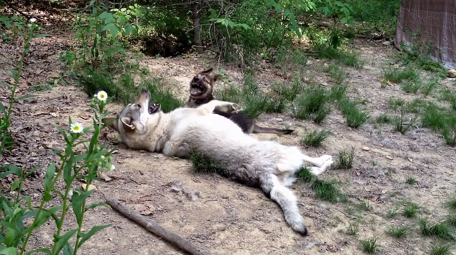 果然就是比較大的狗!狼與小德牧玩耍 太開心還滾到地上「一起哈哈大笑」