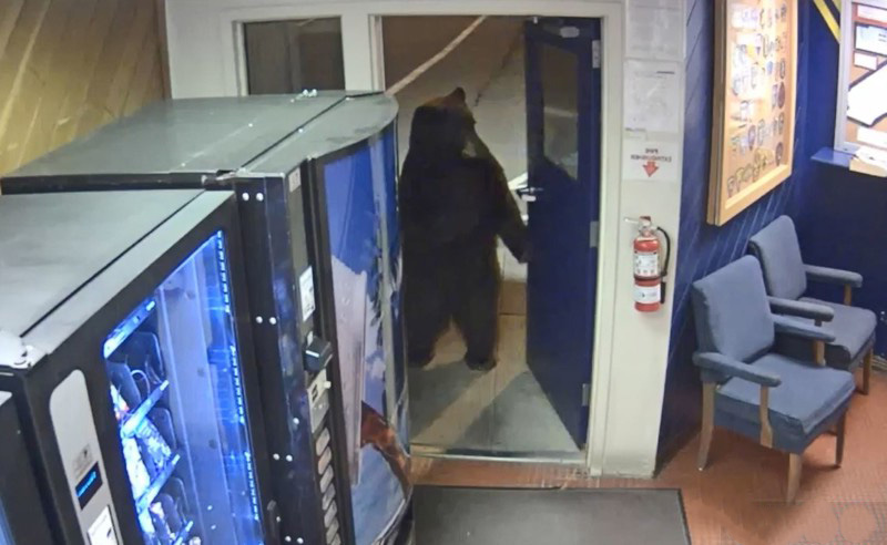 ▼牠在裝滿零食和飲料的自動販賣機邊徘徊一番,就往更裡面去了。這隻熊動作慢悠悠的,態度悠閒,在警局內玩了一會兒後,才順著進來的門走出去。