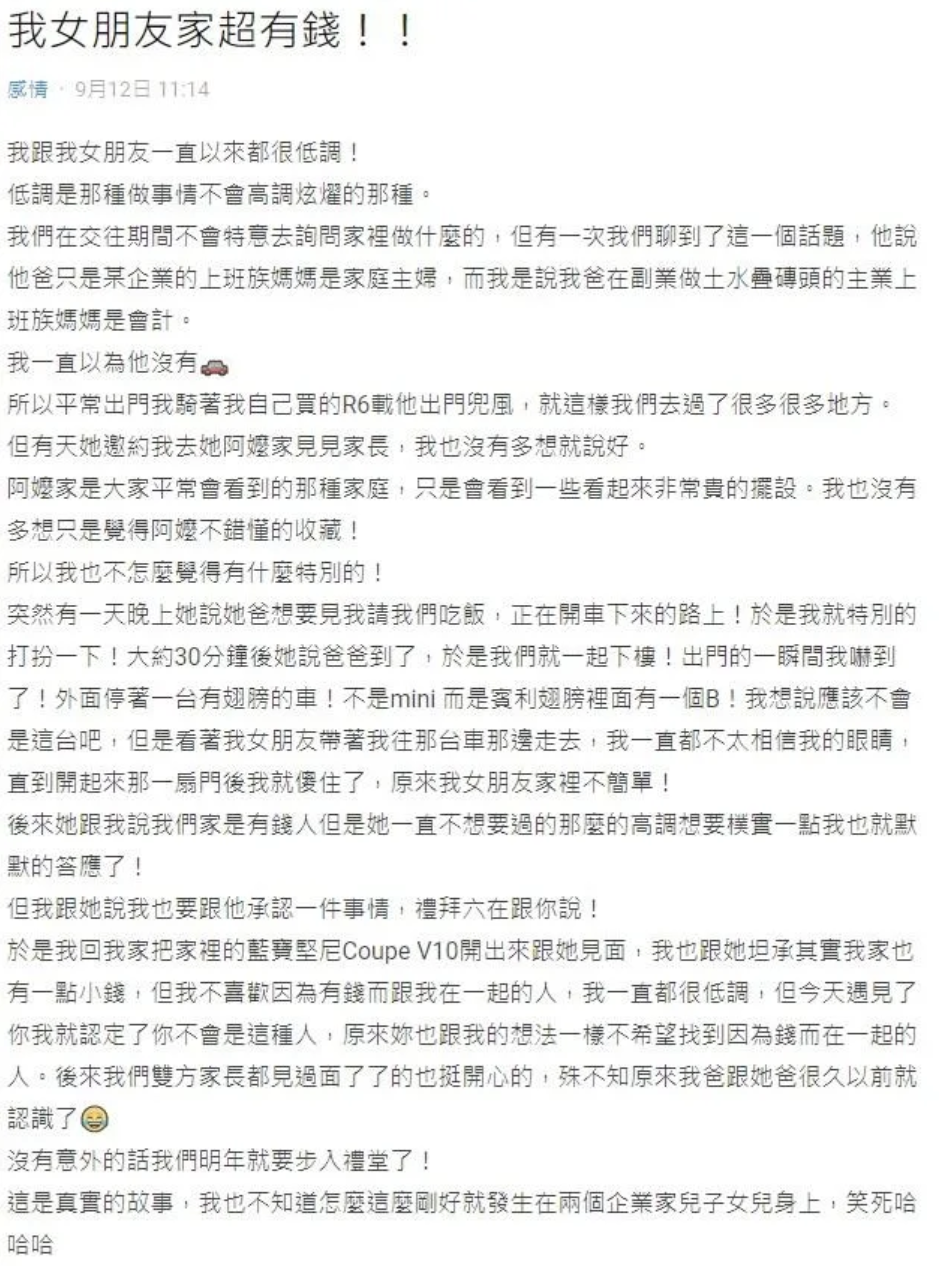 2021年09月16日雖說愛能衝破一切障礙,但很多人戀愛時也會考量到「家世」問題,擔心雙方家庭背景差太大,生活中會出現矛盾。日前一位男網友在Dcard上發文表示,自己和女友交往初期,雙方都說來自普通家庭。有一天他看到女友家人開賓利車接送她,才知道女友家超有錢。不過他家也不差,他坦言自己有台藍寶堅尼,也是富二代~