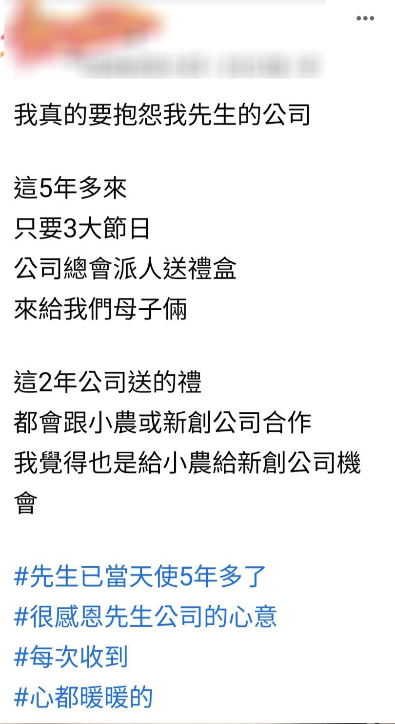 ▼原PO感恩的表示,「這5年多來,只要3大節日,公司總會派人送禮盒來給我們母子倆」,表示很感激公司的心意,就算自己先生早在5年前已經去天堂當天使了,公司仍然持續會送禮盒來,而且這2年來,公司送的也都是跟小農或是新創公司合作的禮盒,讓她既覺得收到心暖暖的,又覺得公司願意給小農和新創公司機會很不容易。