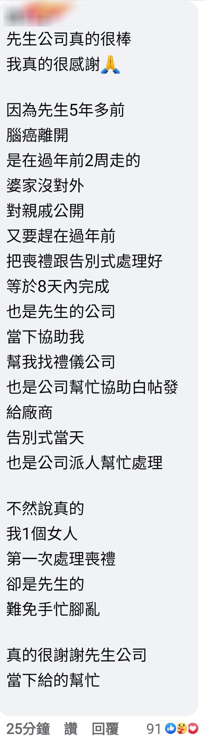 ▼原PO在貼文下面補充,自己的先生早在5年多前已經離開人世了,當時因為時間有點趕,所以是由公司幫忙協助處理的,在後續的告別式喪禮處理上,也受到了先生公司的多方協助,讓她當下就非常感激幫忙。