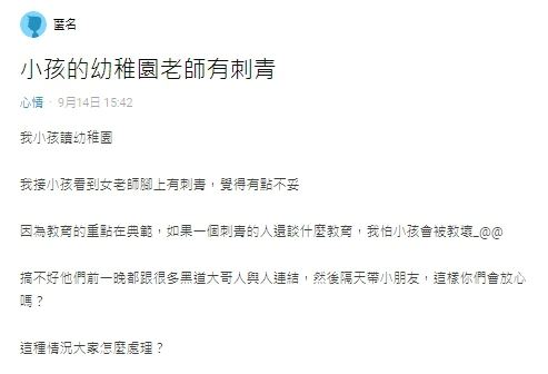 原po表示,他的小孩正在讀幼稚園,不久前他到幼稚園接小孩放學回家時,無意間發現其中一個女老師的腳上有刺青。他覺得非常不妥當,「搞不好他們前一晚都跟很多黑道大哥人與人連結,然後隔天帶小朋友,這樣你們會放心嗎?這種情況大家怎麼處理」。原po還在留言中說:「也有其他沒刺青的老師,為什麼偏偏要聘一個有刺青的,看了就怪怪的,有一種污染的感覺。」
