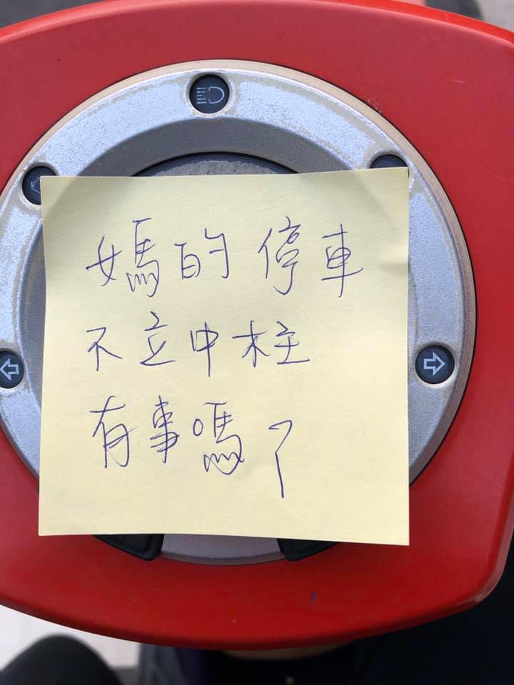 ▼有路人在原po的機車上留下一張紙條,上面寫著:「媽的,停車不立中柱有事嗎?」原po感覺很受傷,無奈說:「難道停機車有規定一定要踩中柱,不能側停嗎?側停的人就活該要被罵?」