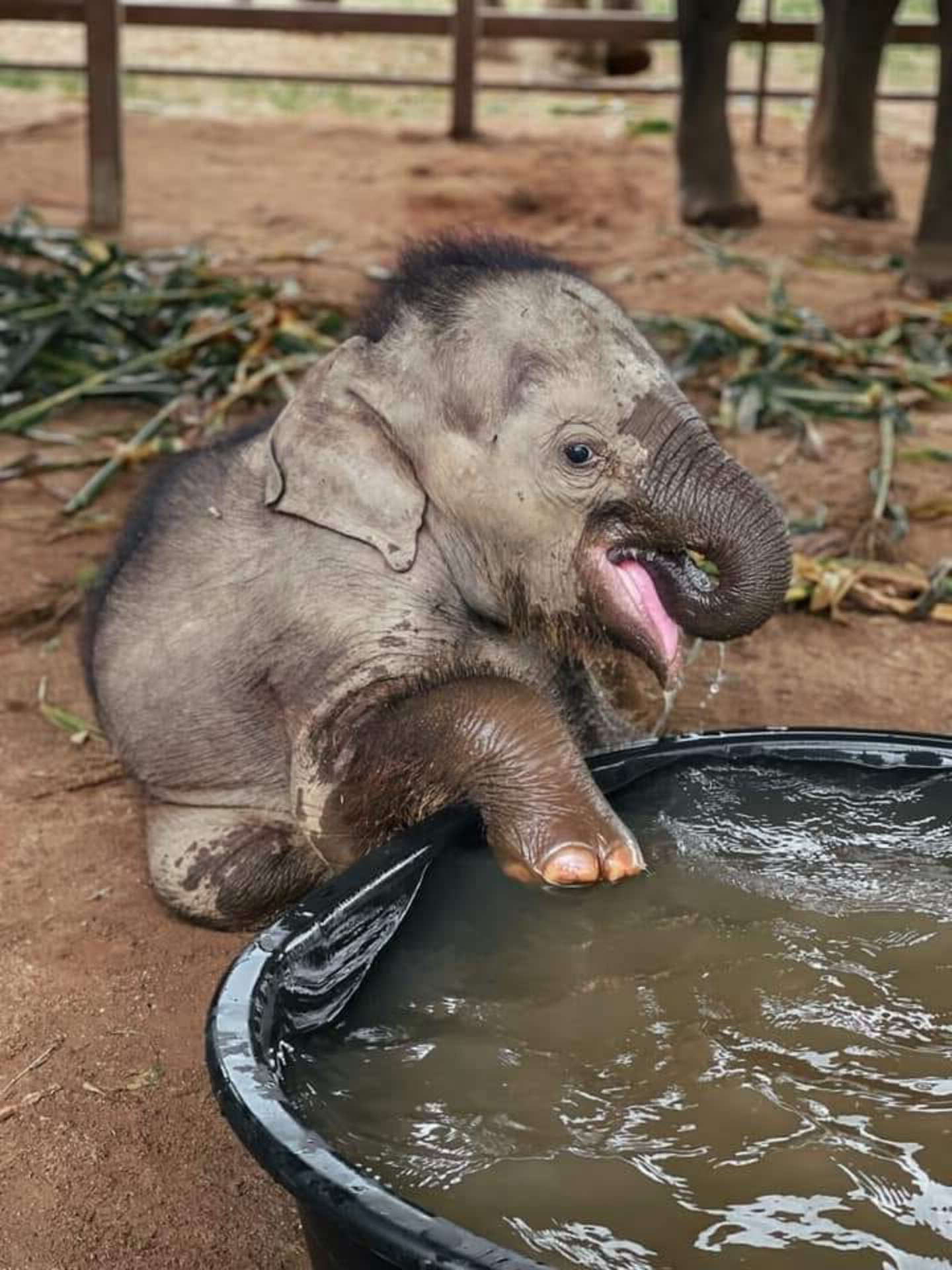 ▼自然公園為Bunma和Chaba準備了見面禮「大象蛋糕」,等牠們吃完,還給Chaba洗了一個澡。這是Chaba第一次洗澡,牠非常喜歡玩水,開心地潑水花、玩水管,在盆子裡滾來滾去,看起來非常開心。Chaba玩了一會兒,就跑去跟媽媽撒嬌,母子相處的畫面非常溫馨。