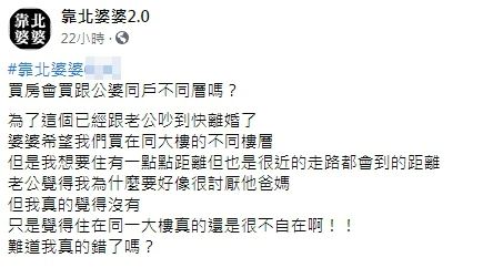 2021年09月28日婚姻跟戀愛不同,要處理跟雙方家人之間的關係,有時未免會有磨擦。日前一位人妻在臉書社團「靠北婆婆2.0」抱怨,婆婆堅持要跟他們夫妻倆住在同一棟大樓,雖然是不同樓層,但還是讓她倍感壓力。小倆口因為這件事發生爭執,她忍不住問:「難道我真的錯了嗎?」