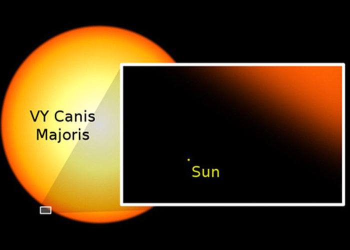 ▼​在我們眼中大到不可思議的太陽,跟大犬座的紅色特超巨星VY相比,又變成了弱小的存在。