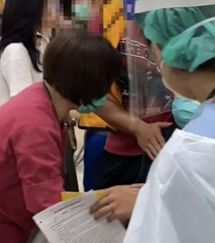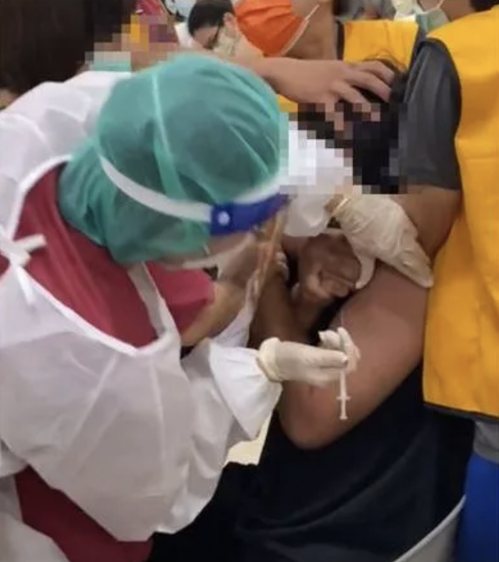 ▼從影片中可以看到,一名身材高大的男同學坐在椅子上,醫護人員正在為他酒精消毒。眼看就要打針,他竟忍不住大聲嘶吼起來,一直哭喊「等一下啦」。4、5名志工和護理師見狀,連忙過去安撫他,有人抱著他的頭,有人牽著他的手,還有人伸手遮擋他的視線。