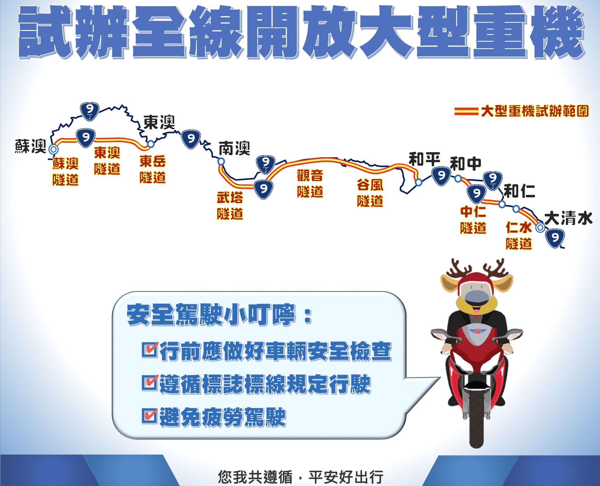 ▼現在這一試辦計畫已交由交通部核定,將由今年9月30日中午12時起試辦大型重型機車通行蘇花改路段,期間為期6個月。開放通行路段為蘇澳至東澳段(台9線104K+130~113K+420)、南澳至和平段(台9線124K+640~145K+061)及和中至和仁段(台9線148K+840~154K+149)。試辦期間委託評估單位將以抽樣方式觀測與檢核隧道內的秩序、行為、安全及環境等指標,並據以分析評估開放大型重型機車通行的適宜性。