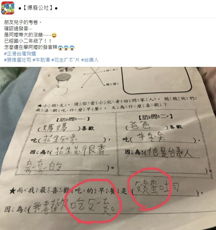 是阿嬤帶大的!小二童考卷出現「台灣狗以」 網笑:口音很重!
