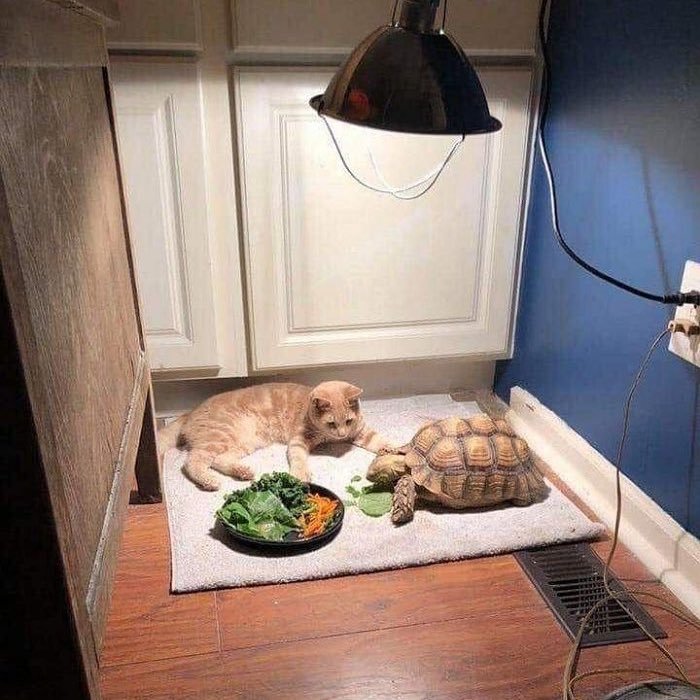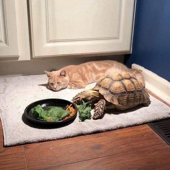 不同物種的動物也能成為好朋友,牠們相處的畫面太可愛,看起來超療癒。不知道烏龜什麼時候才能吃完,貓咪都等到睡著了~