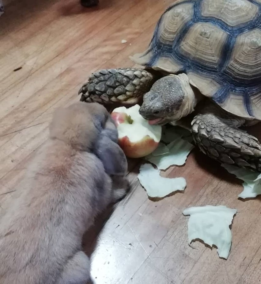 ▼網友們看到後都被貓咪和烏龜的互動萌到,有人分享自家烏龜和兔子一起吃飯的畫面,只見牠們分享同一顆蘋果,看起來很和諧。