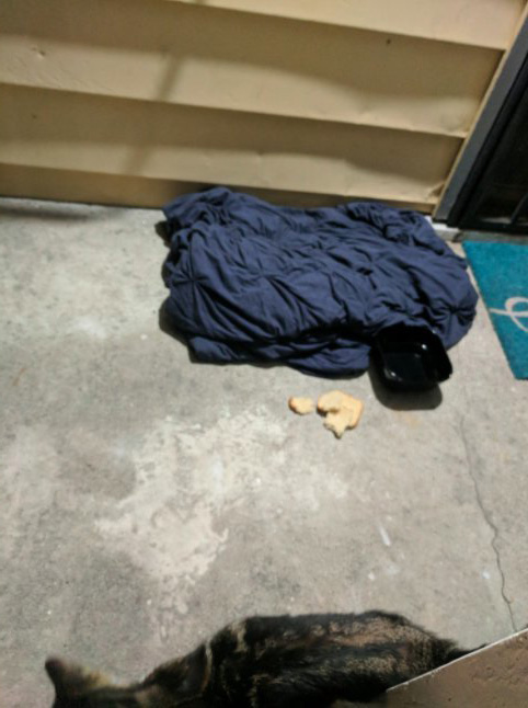 ▼因為Connor要出門找朋友,所以他在庭院裡留下棉被和食物。他希望小貓能喜歡這裡,安心等自己回家。