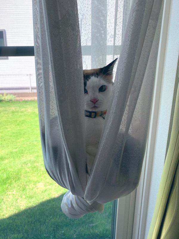 ▼推主表示,那天他趁天氣好,把落地窗前的白色透光窗簾綁起來,想讓更多陽光灑到屋裡來。沒想到過了一會兒,窗簾變得不對勁了。原來是Chobi跳了上去,牠端坐在窗簾上面,一臉嚴肅地看著主人,讓推主覺得非常好笑。