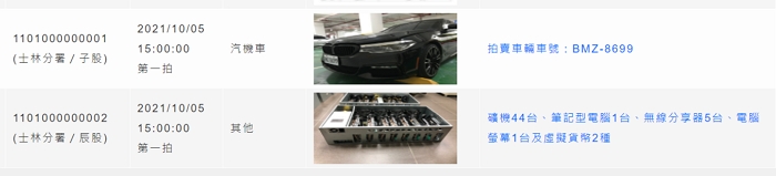 2021年10月04日法務部行政執行署各分署將於5日舉行「123聯合拍賣」,其中士林分署張貼出的拍賣物品公告引發各方關注。因為拍賣物品中包括BMW罕見車款「540i xdrive」、44台虛擬貨幣挖礦機,還有泰達幣USDT、以太幣ETH等2種虛擬貨幣~