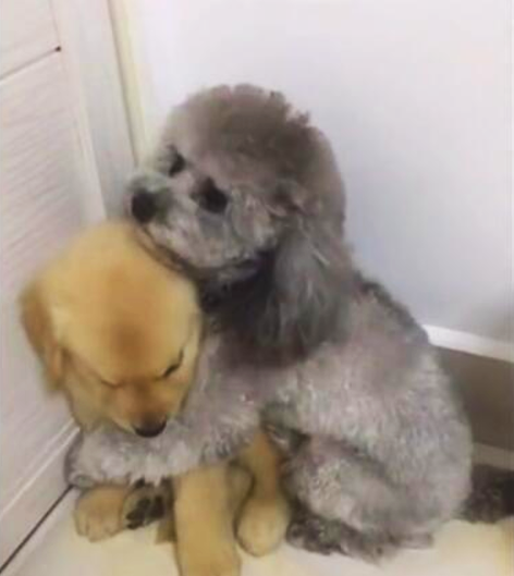 「迷你金」做錯低頭怕責備 貴賓犬哥哥一把摟住:你要罵就罵我好了!