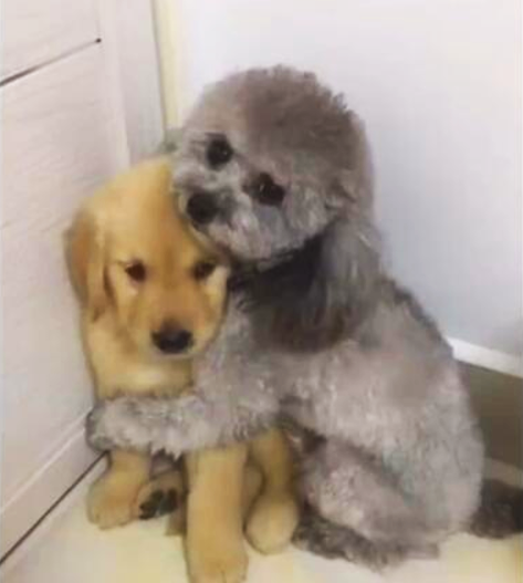 ▼一名叫做「萌寵叔叔」的網友在微博上發文表示,自己家中養了兩隻毛小孩,分別是一隻金金和一隻貴賓。某天可愛的金金在家搗蛋,讓主人忍不住板起臉對牠呵斥,沒想到中途貴賓竟然將金金抱緊,仿佛在說「要罵就罵我吧!」讓他好氣又好笑。
