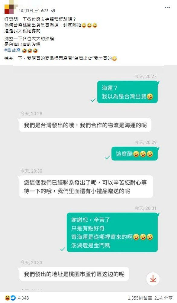 ▼這名女網友在臉書社團「爆廢公社公開版」發文表示:「為何台灣桃園出貨是寄海運,到底哪招,還是我太孤陋寡聞?」她po出與賣家的對話截圖,可以看到其中夾雜著簡體字,而且還會出現「的呢」的語助詞。她非常無奈,表示購買時看標題寫著「台灣出貨」才買的。