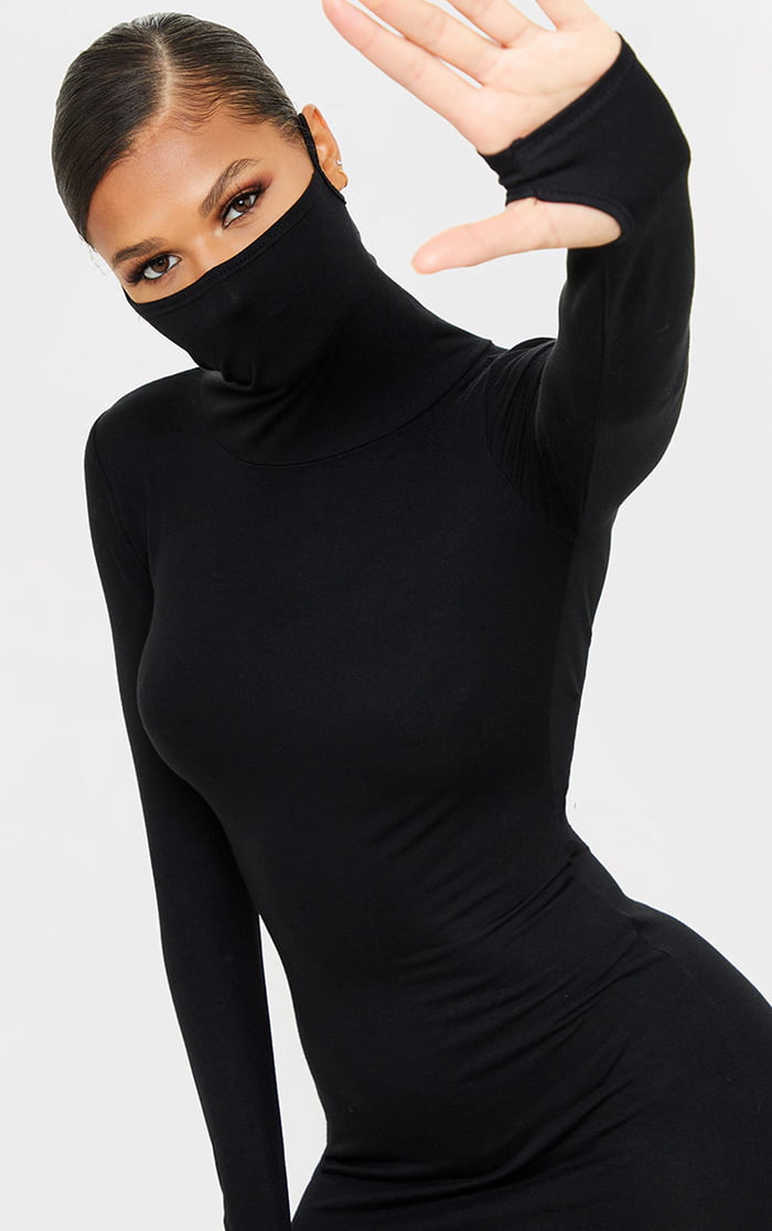 2021年10月09日疫情期間人們都戴起口罩防疫,如果沒有口罩的話,用圍巾、衣物遮掩口鼻,也能起到保護作用。日前英國流行網站「PrettyLittleThing」推出了一款超有創意的黑色連身裙。這件連身裙看起來沒什麼特別,但能很好得凸顯身材,高領還能當口罩來用~