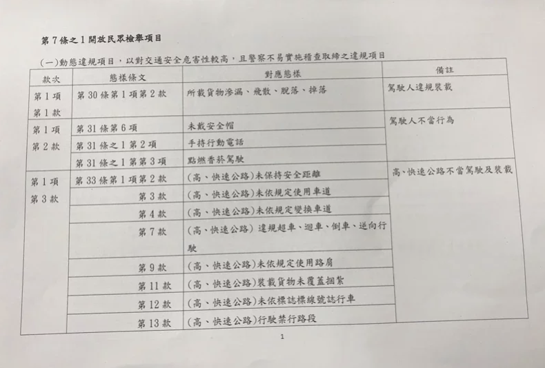 ▼根據交通部提出的46項開放民眾檢舉項目中,「動態違規」項目包括高、快速公路不當駕駛及裝載,如果未保持安全車距、未依規定變換車道,以及連續按喇叭變換燈光或其他方式迫使前車讓道等;也包括不當駕駛行為如危險駕駛、兩車以上競駛等樣態。
