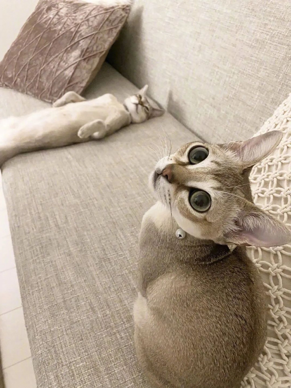 ▼另一隻貓咪蹲坐在旁邊,一臉困惑地看著牠,似乎也被這誇張的睡姿驚到了。