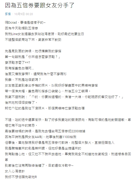 2021年10月11日振興五倍券於8日起開放使用,已經有不少民眾領到。日前一名男網友在Dcard上發文說,自己帶女友去海底撈吃飯慶祝生日,最後用五倍券付錢。沒想到女友並沒有開心的感覺,飯局結束後更是直接翻臉走人。這讓他非常無奈,感嘆:「女人心海底針。」