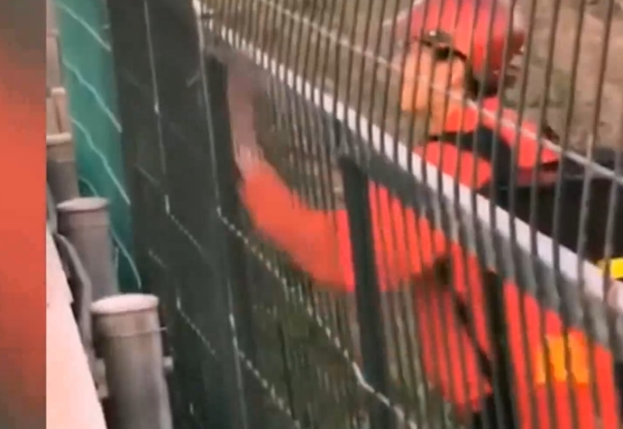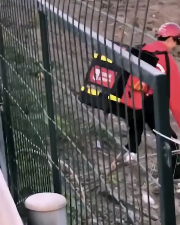 ▼只見這位外送員穿著紅衣的工作服,揹著黑色外送箱。他爬上邊坡,隔著柵欄將餐點交給一位身穿黑衣的民眾,還敬業地說:「祝你用餐愉快!」將餐點送到顧客手中後,他轉身淡定離開。