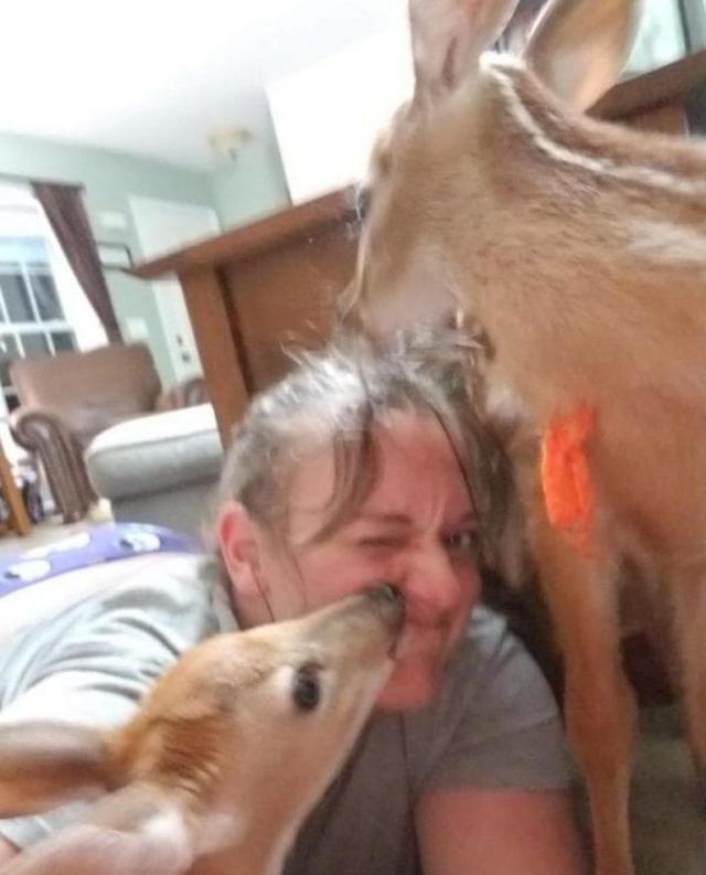 ▼「原本想在外邊幫它們找個能遮風擋雨的地方,沒想到它們早就找好了舒適的避難所。」女孩陪幾隻小鹿在客廳度過了愉快的一晚,看得出牠們都很開心,甚至還親了女孩一口表示感謝。