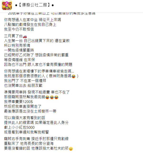 ▼原po在臉書社團「爆廢公社二館」發文表示,今年3月,她自己花錢買了人生第一台新車,車子還在還貸款。她將愛車停放在自家樓下的停車場,有一天準備用車時,發現不能繳費,車也不見了。「你有想過人在家中坐,禍從天上來嗎?八點檔的劇情發生在我自己身上,我至今仍不敢相信!」
