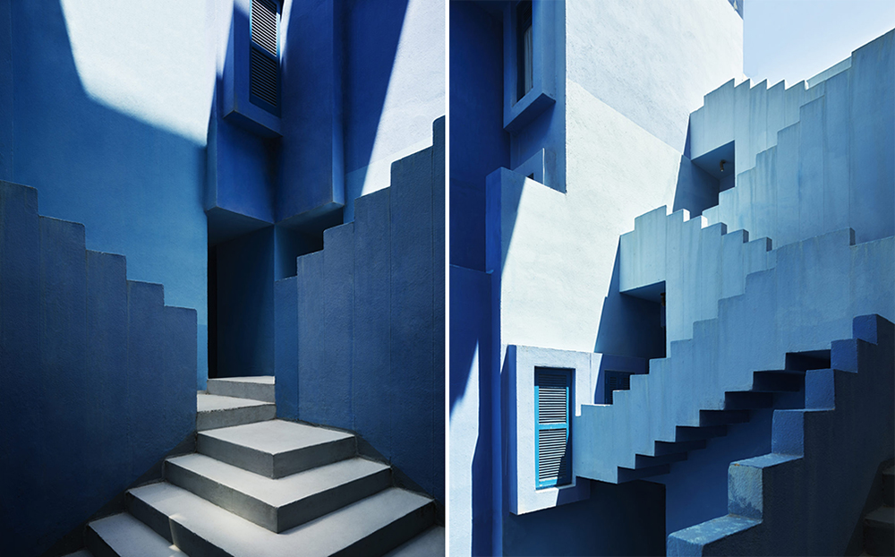 ▼La Muralla Roja的外牆是粉紅色,內部則是柔和的藍色。深淺不一的粉色、藍色,與周圍的環境完美融合,還有塔樓中相交的十字結構,都給人一種夢幻的感覺。