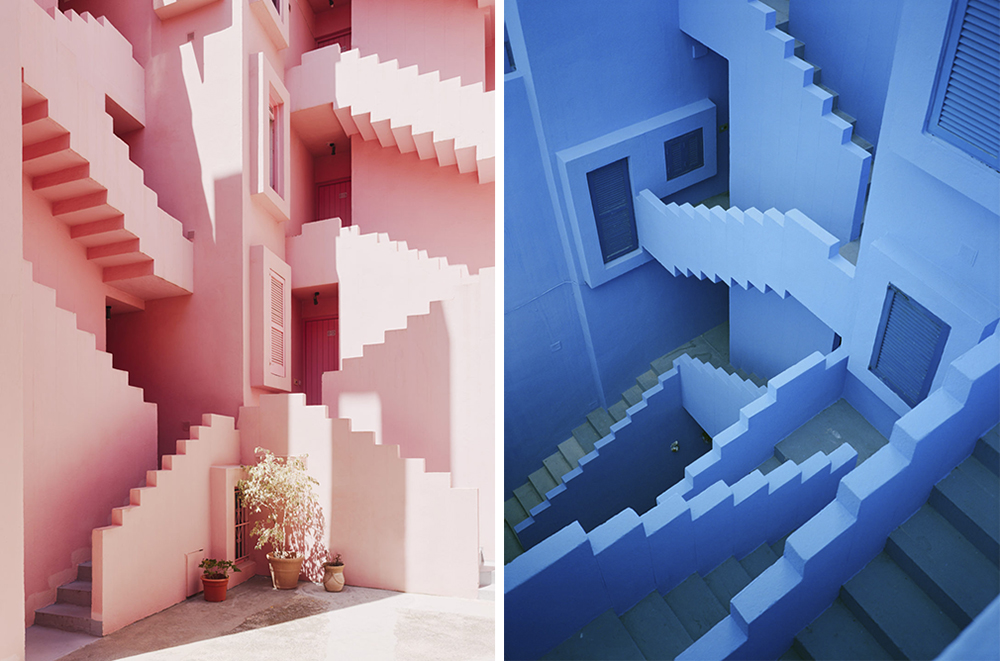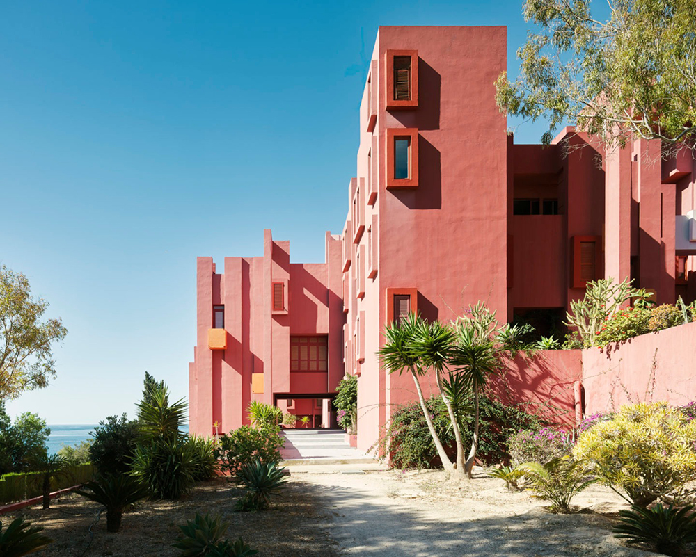 ▼La Muralla Roja在西班牙語中是「紅牆」的意思,Ricardo Bofill從北非卡斯巴古城(Kasbah)和地中海阿拉伯建築中汲取靈感,將庭院、開放式樓梯與橋樑等伊斯蘭建築的傳統元素融合進來,再加上粉色和藍色的色調,讓這座建築成為永恆的經典。