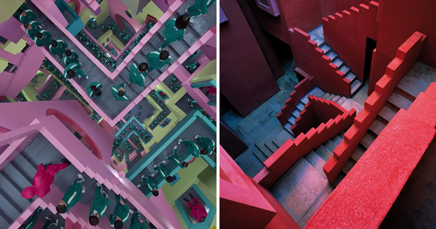 ▼《魷魚遊戲》中的「彩色樓梯迷宮」色彩鮮豔、設計有趣,跟殘酷的劇情形成鮮明的對比。
