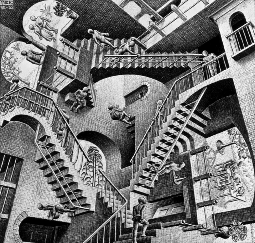 ▼《相對論》是艾雪最具代表性的作品之一,這幅畫作中就像同時存在3種不同的重力,錯綜複雜的樓梯構建出一個魔幻的世界。