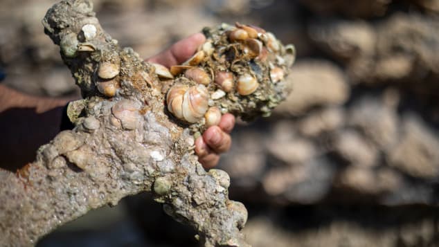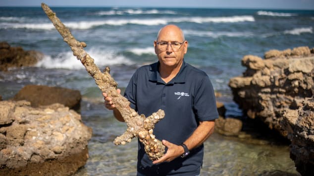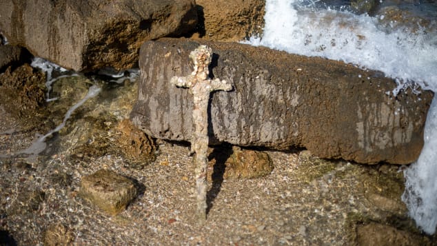 ▼以色列文物局18日宣布,一名叫Shlomi Katzin的業餘潛水員發現了這把古劍。古劍上覆滿海洋生物,但總體保存完好。現在這把劍已經交給以色列文物局研究、保管了。